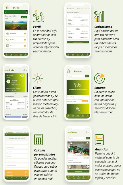 AgroTrader llega para revolucionar el sector agrícola. Es una aplicación para dispositivos móviles que pone en la palma de la mano de los agricultores toda la información necesaria para ayudarles a tomar las mejores decisiones sobre su cultivo. Fácilmente personalizable y muy sencilla en su manejo, la App ofrece una serie de herramientas totalmente innovadoras cuya interacción proporciona información de gran valor en el trabajo diario del agricultor.