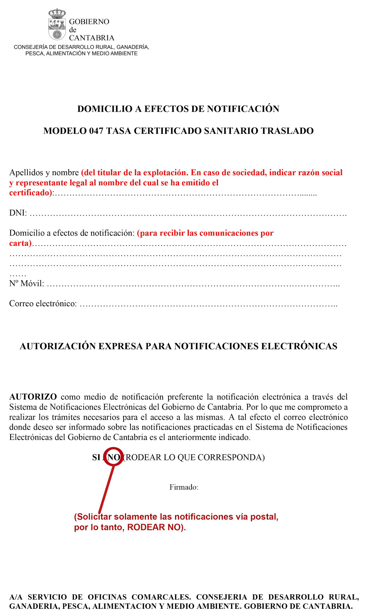 Para los ganaderos que quieran seguir recibiendo las tasas vía postal, mediante una carta a su domicilio, les informamos de cómo rellenar el documento que se está entregando a los ganaderos que realizan guías de traslado de ganado fuera de Cantabria.