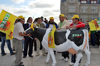 Los máximos responsables de COAG han calificado de decepcionante el encuentro que, durante una hora, han mantenido con los representantes del Ministerio de Medio Ambiente, Medio Rural y Marino (MARM). Madrid/ Santander, 7 de septiembre 09. La Coordinadora de Organizaciones de Agricultores y Ganaderos (COAG) ha reclamado hoy al MARM y a la Comisaria de Agricultura de la UE, medidas concretas, urgentes y eficaces para hacer frente al hundimiento del sector lácteo. Más de un millar de ganaderos, procedentes de Castilla La Mancha, Castilla León, Cantabria, Asturias, Galicia y País Vasco, se han concentrado frente al Palacio de Magdalena en Santander, coincidiendo con la presencia del Secretario de Estado de Medio Rural y Agua, Josep Puxeu, en los cursos de verano de la Universidad Internacional Menéndez Pelayo (UIMP). Los representantes del MARM se han negado a recoger una vaca de poliéster, de tamaño natural, que COAG tenía intención de regalar a la Ministra Espinosa como símbolo del tipo de ganaderías que van a quedar en España y en el resto de la Unión Europea si se siguen aplicando las actuales políticas agrarias de liberalización de los mercados, extremadamente perjudiciales para las pequeñas y medianas explotaciones lácteas. Los máximos responsables de COAG han calificado de decepcionante la reunión que, durante una hora, han mantenido posteriormente con los representantes del Ministerio de Medio Ambiente, Medio Rural y Marino. Durante el encuentro, Miguel Blanco, responsable de Organización de COAG estatal, ha entregado un documento con las principales reivindicaciones del sector: – Garantizar una renta suficiente a todos los productores de leche, gracias al control de la producción y a un precio mínimo de compra por parte de las industrias lácteas, que al menos cubra los costes. – Derecho a la negociación colectiva de los precios de la leche entre los representantes legítimos de los ganaderos y la industria. – Reducir la producción láctea europea, como primer paso para eliminar el acuerdo de la UE que fija el incremento de un 1% anual de la cuota láctea asignada a cada EE.MM. – Introducir un control público de la producción que adapte la oferta a la demanda. Para ello es imprescindible el mantenimiento del sistema de cuotas más allá de 2015. – Promover una producción lechera más extensiva, basada en el territorio y menos dependiente del exterior. – Desarrollar una nueva política láctea dentro de la reforma de la PAC, prevista para 2013, donde el marco de la Organización Mundial del Comercio (OMC) se sustituya por el de la soberanía alimentaria, algo indispensable para hacer frente a los retos de la crisis sistémica actual. Respecto al acuerdo para afrontar la crisis de precios del sector, que rubricaron el pasado 20 de julio todas las partes, a excepción de COAG, los representantes esta organización han reiterado su rechazó al mismo porque, tal y como se ha visto en el último mes, el contrato tipo está siendo incumplido de forma masiva por las industrias y no garantiza un precio mínimo para los ganaderos que al menos cubra los costes de producción. No obstante, se ha solicitado al MARM la participación de COAG en la Comisión de Seguimiento porque “tenemos derecho a no estar de acuerdo con el contrato y a controlar que ocurre entre Gobierno, industria y distribución, puesto que representamos a miles de ganaderos” ha argumentado Miguel Blanco. Tras los actos de protesta, COAG ha organizado una jornada de análisis sobre la crisis del sector lácteo en el edificio anexo al Palacio de la Magdalena. Ganaderos de las diferentes CC.AA. y de la organización agraria francesa Confédération Paysanne (CPE), debaten en estos momentos sobre el presente y el futuro de los sectores ganaderos en Europa.