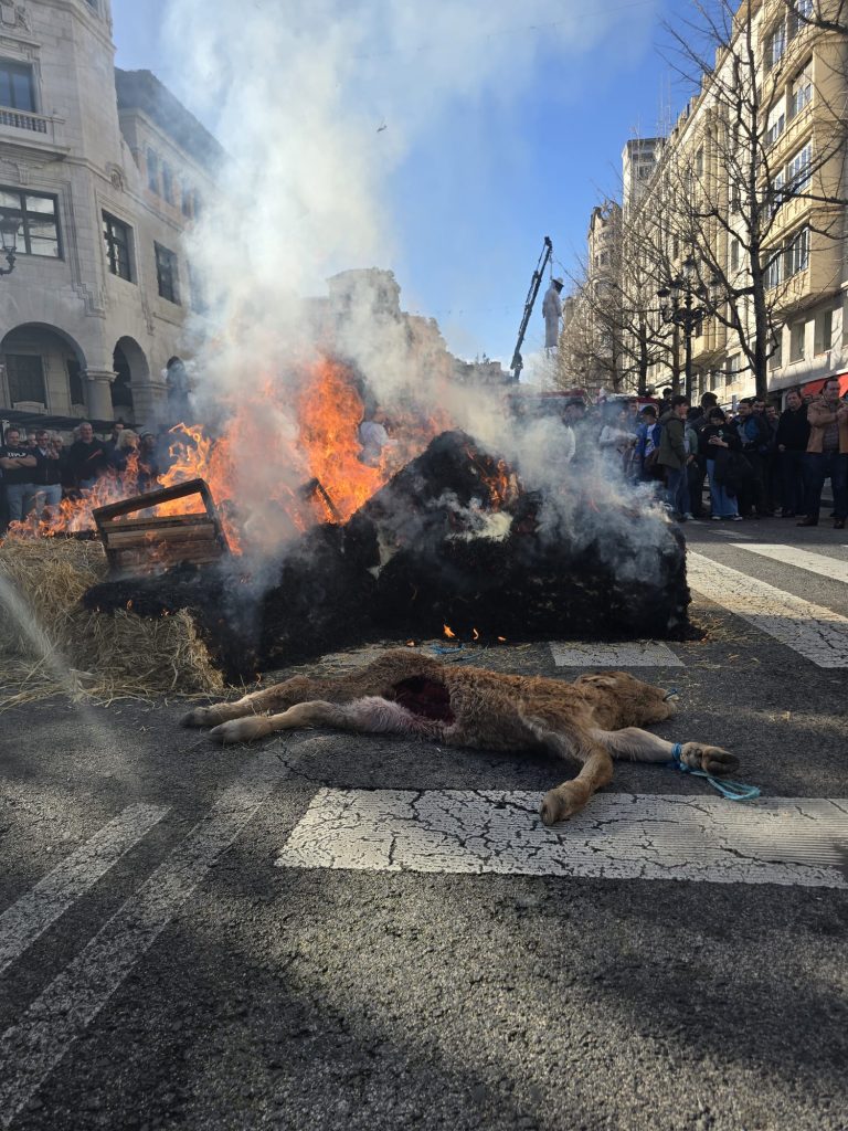 Tras calmarse mínimamente la situación, llegó uno de los momentos más simbólicos: la lectura del manifiesto por parte de Clara, joven y futura ganadera del valle de Soba. Ella representa a toda una generación que quiere seguir en el campo, pero que ve cómo se lo ponen muy difícil. Este manifiesto también sirvió para enviar un mensaje a la clase política: “somos nosotros los que os ponemos ahí y también los que os podemos quitar”.