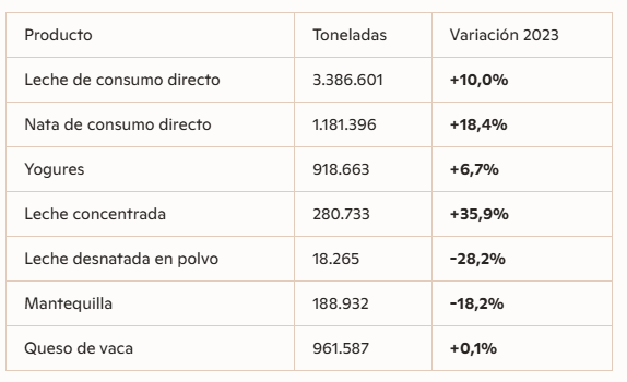 - 2.942.720 toneladas de leche de consumo (-2,8% respecto a 2022).