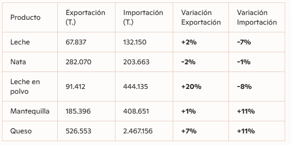 - La balanza comercial del sector lácteo sigue siendo negativa, con una caída del -8,2% en 2024.