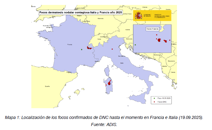 El Ministerio de Agricultura, Pesca y Alimentación informa que el pasado 19 de septiembre se ha confirmado un nuevo foco de Dermatosis Nodular Contagiosa (DNC) en el municipio de Saint-Laurent de Chamousset, Departamento de Ródano (Francia). Este caso representa un salto significativo de la enfermedad, al localizarse fuera de la zona previamente restringida y a más de 100 km del foco más cercano.
