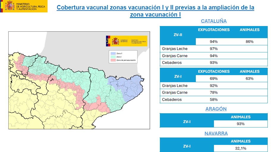 El 89,1 % del ganado bovino de los diez departamentos del suroeste afectados está ya vacunado, lo que supone 638.952 animales inmunizados. La vacunación de emergencia avanza con rapidez en las zonas fronterizas con España.