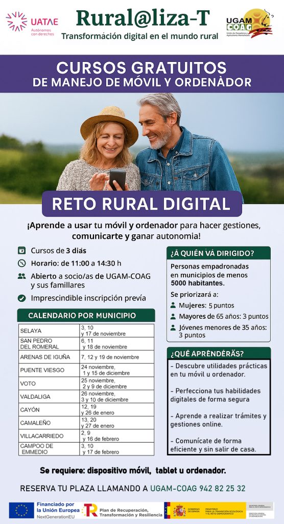 UGAM-COAG y UATAE ponen en marcha el programa Rur@liza-T: Transformación digital en el mundo rural, con el objetivo de acercar el uso práctico de móviles, tablets y ordenadores a las personas que viven en municipios de menos de 5.000 habitantes. Bajo el marco del proyecto Reto Rural Digital, se impartirán cursos gratuitos de tres días, dirigidos a socios/as y sus familiares.